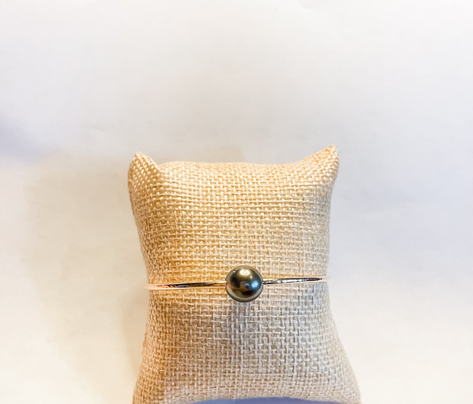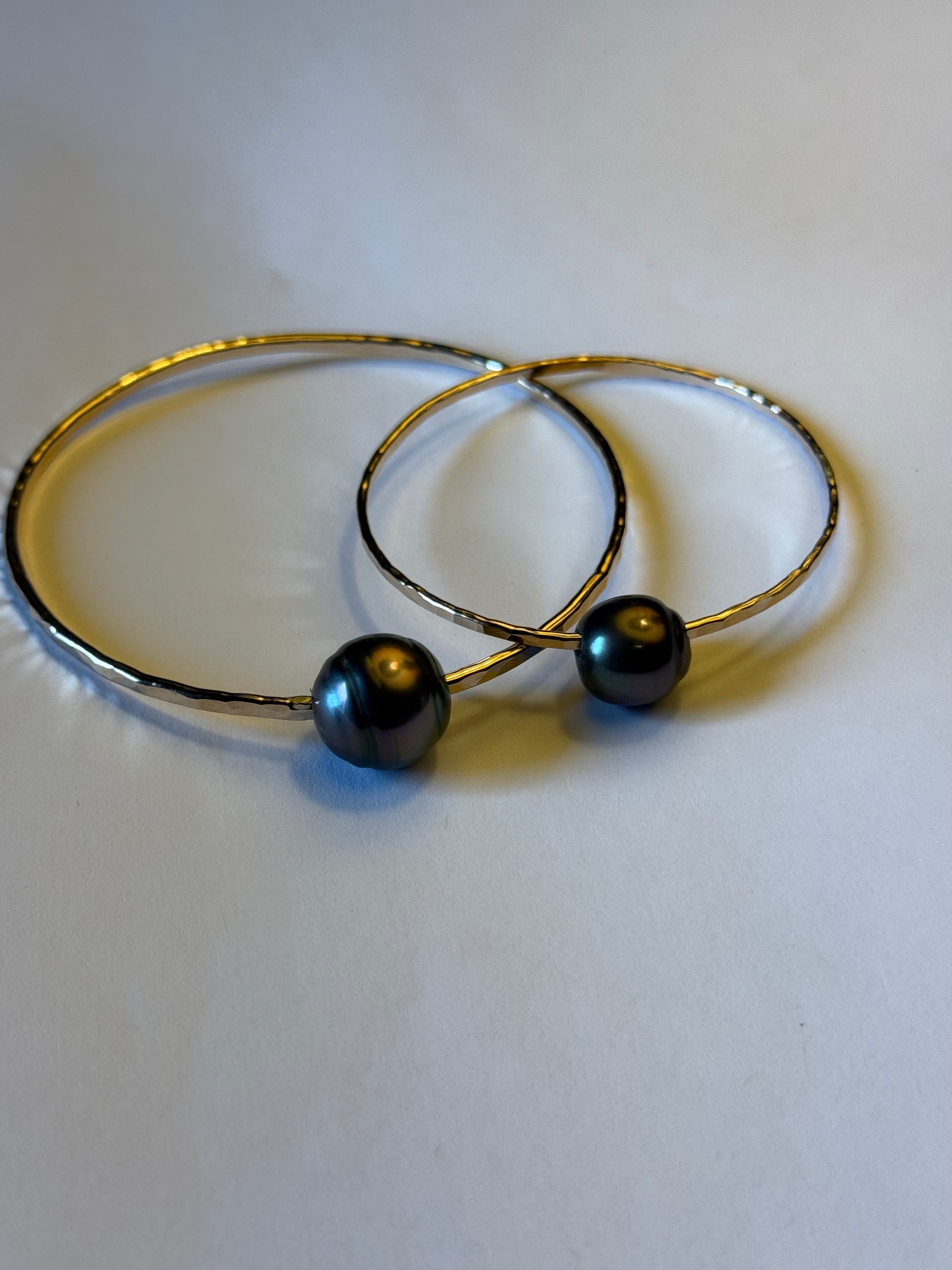 14K gold filled classic Tahitian pearl bangle. Made with 12gauge wire hammered and polished for that extra sparkle.